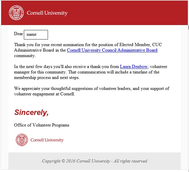 Make your giftA helpful tool for working with your volunteers. It's easy to search through Cornell's many volunteer opportunities, submit a nomination, manage your volunteer nomination process, recommend or refer a volunteer, share documents, create clear expectations with position descriptions, and more!